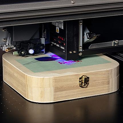 Crie imagens vibrantes e impactantes de alta qualidade numa grande variedade de objetos e substratos, incluindo metal, plástico, cartão, madeira, tela, vinil, papel e muito mais, acomodando material com até 200 mm de altura.